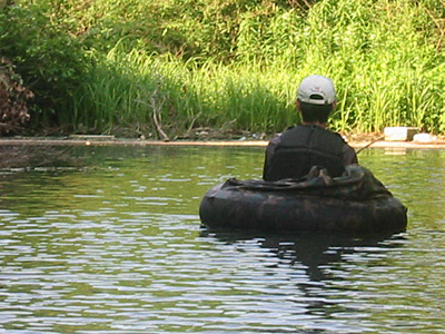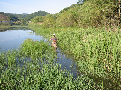![]() えー、今回は神奈川県からI氏の釣行記です。 バスから降りたところ。 ![]() I氏:「おはようございます。きちゃいました」 案内人:「写真とります!写真!」 振向きざまに写真をとる。 I氏は四国は初めてだという。 しかもフローターもやったことない。 フライでバスも釣ったことがないそうで、 半分観光もかねているらしかった。 とりあえず、前回好調だったふろりだ池に向う。 ![]() ふろりだ池にて準備をするI氏 I氏の愛用ロッドはABUだった。これは意外だった。 ![]() なんと、フェンウィックのOEMグラスの8番!すごい。 ![]() リールもABUのデルタ3。 ![]() びっくらこいた。 タックルは全部ABUでした。 それもそのはず、じつはI氏 Fishing with ABU というHPをもっている それにしても、やはり..というか、このツアーに参加する人達は なにかしら、タックルにこだわりを持ってる人が多い。 フツーの道具持ってくる人はまずいない。 たとえば、グリップに布袋竹つけて喜んでる人とか、 1オンス以上もあるトッププラグでブッシュ突き破って喜んでる人とか。 早速、釣りを開始するI氏 ![]() 立ち込んでしばらくはいい感じだったのですが、 すぐに、突風が吹き始めた。うねる、ふろりだ池 ![]() それでもキャストを繰り返すI氏。しかし出ない。 ![]() 天気もどピーカンに晴れてしまい、結局ノーバイト。 これだから釣りは怖い。先週の激釣がウソのようだった。 ![]() 池を上がるとき、I氏がウェストバックの中身を全部出していた。 なんと完全に浸水していたのでした。 ![]() 次はダム湖へと向かった。 ダムサイト近くの階段からフローターをおろすI氏 ![]() しかし、この天気である。おまけに風も強い。 ![]() ブイ際のゴミ溜りを狙うI氏 ![]() グラスの8番できれいなループを作っていた。 ![]() しかし反応なし。 I氏:「フローターいいですね〜。」 ここまで全く釣れていないのに、釣果について触れないI氏。 案内人:「そうでしょ、フローターいいよね〜」 釣果に触れず、ごまかす案内人。 結局午前中の釣りはノーヒットに終わった。ショック! 案内人も40cm位のバスをジャンプ一発でバラしたのみ。 やばい。 ここまでノーフィッシュ。 それでも腹が減っては戦はできん。うどん屋へと移動するのでした。 ![]() 釣れなくても、うどんは食える。ここはいつもの谷川うどん。 うどん屋の前に立つI氏。それにしても、ここはうどん屋には見えない。 まるで農家の庭先のようです。それでも昼時になると、どこからともなく 人が集まって行列ができるのです。 ![]() 切り出す案内人 「今日は、いい天気ですね。」 I氏:「ええ、ほんとにいい天気ですね。」 案内人:「バスは釣れませんね。」 I氏:「ええ、釣れませんでしたね。」 案内人:「どうしましょうか?」 I氏:「まかせます」 ということで、西へと移動するのでした。 ![]() 溜池うじゃうじゃ地点に到着 ここで、I氏記念すべき?フライでの初バスゲット。 I氏:「一応バスですね」 案内人:「いやいや、それがバスです。おめでとうございます。」 小さいバスでもバスはバス! バスはサイズではあーりません! おめでとう、おめでとう! 案内人、かなり大袈裟にはやし立てるのでした。 ![]() これはちょっとだけサイズアップ。 ![]() それでも30cmがやっとだった。 うーん、厳しい。厳しすぎる。 では次に移動しましょう。 次も小さな野池である。 実績はあるが、なんせ強風と馬鹿晴れ。 案内人もここで何とかまともなサイズのバスをゲット。 ![]() ![]() やはりこれくらいのサイズがでないと釣ったきがしません。 ここは魚影は濃かった。小さめのフライにチェンジし、 子バスやギルを釣るI氏。めざしサイズのバスの写真を撮っていた。 ![]() ふびんであった。 ワンドの奥のゴミ溜まりを攻めるI氏。 ![]() バシャバシャ! ![]() やはり出てくるのは子バスばかりでした。 結局この日はこれで納竿。 温泉に入り、キャンプサイトを設営するのでした。 炭に火をおこすI氏 ![]() ナイターの準備 ![]() ベイトタックルも、もちろんABUだった。 バーベキューしながら、ジタバグをカポカポやるI氏 ![]() バイトはあるものの、のらない。きっと子バスが突いているのだろう。 一日目終了。
