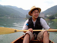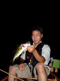 今回は千葉県から、T氏の釣行記です。 T氏はこのツアーは3度目の参加です。 予約はかなり前から入っていたものの、3度目ともなると お互いなれたもので事前連絡はほとんどとらなかった。 前日に案内人が確認電話を一本入れただけである。 案内人:「あしたくるんだよね」 T氏:「いくよー。」 これだけで、ひとりで四国まで来てしまうというのもすごい。 到着時間や到着場所も、ほとんど暗黙の了解であった。 迎えに行ったら、ほんとに来ていたって感じ。 この人がT氏である。 実はDon West B.B.P.の関東営業所長でもある。 ![]() カメラを向けるとこのリアクション。 さすが、関東営業所長。パフォーマンスは抜群だ。 今回はカヌーメインでやるため、フローターなどの事前送付荷物は一切なし。 天候はうす曇で風もなく、バスを釣るにはなかなかグッドなコンディション。 まずはダム湖へと向かった。 コンパクトな手荷物で、さっぱりした様子のT氏。 ![]() ちなみにT氏のロッドはフェンウィックのハイカーボンブランクを 使った自作のグラファイトである。バット部にはバスの絵もプリントされいた。 いかにもカスタムロッドという感じである。付いているガイドがすごい。 全部ワンフットのゴールドサーメットである。すばらしい! ![]() ポイントへ向けてカヌーを漕ぐ案内人。 エレキ全開でなおカヌーを漕ぐ。速い!
