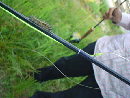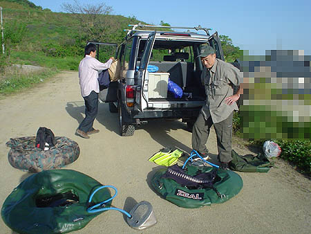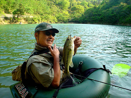 ![]() ゴールデンウィークの谷間にあたる5月2日の晩、案内人は自宅で夜遅くまで T夫妻にオールドタックルを見せびらかして自慢していました。 そしてPM9:00ごろ、携帯電話が鳴ったので見てみると そこには見知らぬ電話番号が・・・。 もしかして・・・。電話に出てみると 「あ、明日お世話になるMと申します」 もう明日から次のBASSツアーがはじまるのです。 ということで案内人はT夫妻を見送り、早めに就寝するのでした。 翌朝 AM6:00にホテル前でM氏をピックアップ ![]() この方がM氏です。いきなりピンボケで申し訳ございません。 じつはM氏は前の晩から香川入りしていたのでした。 ですからバスに揺られて到着したばかりという疲れはなく、 とても元気そうな笑顔が印象的でした。 一方、もう一人の参加者であるF氏は横浜からです。 したがって10時間バスに揺られて到着。 予定ではF氏はAM6:13に高松着の予定なので、そのまま M市を乗せてバス停へと直行しました。 バス停に着くと、一人だけ釣竿持って立ってる人物がいます。 ![]() 10時間バスに乗って、さすがに疲れた表情のF氏。 案内人:「あの〜、Fさんでしょうか?」 F氏:「あ、どうも、Fです。よろしくおねがいします」 ということで、初対面3人組は何の違和感もなく、一台の車に乗り、 一路野池へと向かうのでした。 ![]() 最初の釣り場に向かう道中は、みんな黙っていました。 なんせ3人とも初顔あわせですから共通の話題もなかなかなく、 会話も弾まない状況でした。 そこに切り出したのがM氏でした。 あまり詳しくは言えないのですが、 M氏はいろいろと家庭内に事情がおるようでした。 そしてそれまで黙っていたF氏も F氏:「ボクはもうすぐ子供が生まれるので、女房から、遠くに釣りに行く のは今回を最後にしてくれと言われています・・・。」 釣り好きはみんなたいへんのようです。 こうして、我々は それぞれが家庭に抱える共通の問題について 意見を出しあい、いつの間にか 共感するものが生まれ、 それを通じて打ち解け合い、 最初の池に到着するころにはもう、 「奥さんは敵である」 というような偏った結論に達し、 妙な団結心さえ芽生えているのでした。 ちなみにフライフィッシングがもっとも盛んな国であるアメリカでも、 釣り熱中者は、独身者に限られるらしく、 夫は仕事以外は家族とくつろぐのが普通で、 奥さんの機嫌損ねてまで部屋にこもってタイイングなんてやらないそうです。 だからアメリカでは完成品フライが売れるとか・・・。 最初の池にて。 ![]() フローターを膨らますM氏。 一方F氏のフローターは案内人の貸し出しもの。 ちなみにこの池は案内人の近所の池で(近所といっても車で20分くらいかな) そうとうでかいバスがいると思われます。 実際に50をゆうに超えそうなデカバスを最近バラしたことがある池です。 ただし、普通のサイズのバスが殆んどおらず、 釣れたらもう50オーバーという池です。 ここは案内人も本気でやります。なんせデカバスいますから。 ![]() そういえば "Don West"印のBassBugロッドのプロト2が今春に完成しました。 ちょっと宣伝です。といっても本気で売るわけじゃないんだけどね。 もし本気で欲しい人がいるんなら、もう一本注文して送りまっせ。