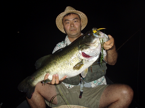 通常、釣行記は釣行した年月日順に書くのですが、 ちょっと今回は大変なことが起きたので、興奮さめやらぬうちに、 先日の琵琶湖釣行記を報告したいと思います。 ![]() 帰りの大津駅にて。妙にニコニコしているボク。 じつは今回の琵琶湖釣行は、八代氏と結構前から計画していた。 前回の琵琶湖釣行が行き当たりバッタリで散々な目にあったから、 今回は地元のプロにバスボートでガイドしてもらおう。 最初はそういう計画だった。 ところが前日になって、かなり大雨が降り、 状況が最悪という連絡が入った。 この時点で、今回の釣行は中止になるはずだった。 しかし、せっかく平日に休みも取ってしまったことだし、 いまさら家にいてもしょうがない。 とりあえず、ロクマルが出そうな場所をガイドが教えてくれるというので まあ、あまり期待してないけど、とりあえず行ってみようか。 ということで琵琶湖釣行を決行したのでした。 ちなみに今回その貴重な情報をいただいたのは、 地元でもデカバスハンターとして知る人ぞ知る グリッドデザインの藤井氏である→琵琶湖今昔話 じつは藤井氏は八代氏の友人であり、かなりのトップ好きらしい。 で、普通、トップオンリーとかフライでバスとかいうと、 ガイドは嫌がりそうなものだが、このガイドは違うようだ。 八代氏によれば、そういう無理難題を言っても大丈夫とのことだった。 具体的に無理難題とは例えば以下のようなことだ。 「フライでロクマルを釣らせろ!」 「五十オーバーをトップで入れ食いにさせろ!」 「一日にロクマルを2匹釣らせろ!」 などなど、最近の釣り人はヘンなやつが多いから、 こういう無理難題も増えているらしい。 それに対応するガイドも大変なわけだ。 しかし実際に藤井氏はそれらを実現させるのだからスゴイ。 やはり持つべきものは友である。 ということで八代氏とオレ(大田)は藤井氏より受けたアドバイスをたよりに 南湖のとあるウィードエリアへと向かったのだった。 夜明け前の琵琶湖 ![]() まだ暗いうちから13フィートのカヌーに55ポンドのエレキで出船。 タックルは八代氏がベイトキャスティング、 オレは船首でフライキャスティングという具合だ。 八代氏はこの日のために琵琶湖に有効といわれている オリザラのメッキカラーを準備していた。 まだ暗いうちは、ビッグバド、そしてかなり明るくなってから オリザラのメッキカラーに切り替えた。 フィィィィィーン・・・・ジャボン ピュ、ピュ、ピュ、ピュ、 すさまじい首振りアクション。 よくまあ、あんなに首を振るものだと感心していると、 突然水面が割れ、バシュ!っとバスがヒットした。 八代氏: 「デカイかもしれない。」 バタ、バタ、バタ! ボク: 「うわ、マジでけー!」 暴れるバスを強引にネットに収め、引き上げた。 ![]() 何と!55cmのランカーだった。 頭がデカく、ずんぐりとしたバス。とにかく体高がスゴイ。 ![]() 嬉しそうな八代氏。 ちょっとピンボケだが、ザラはクチに真横に掛かっていた。 ![]() それにしても実に見事なランカーだった。 もう、この時点で、ボクも八代氏も、とりあえずコレが 今回のビッグワンだなと思っていたことは確かだった。 まあ、55cmなんて普段そう簡単に釣れるサイズではないし、 あと一時間位で日も昇ってきそうだったから。 なんとなくもうダメかなぁという感じだった。 実際に琵琶湖は晴れると釣れない。 確か前回はフローターでドピーカンの日中昼過ぎまでやって、 小バスが2匹釣れただけだった。だから日中はやりたくない。 やってもせいぜい朝8時ごろまでにしよう。 そう話しながら、藻穴にポッパーをキャストしていると、 ゴボ! ![]() ようやくもまともなサイズがボクのフライにもヒットしたのだった。 ちなみに今回使用したフライタックルは、以下の内容だ。 ロッド:スコットのファイバーグラス#8バスアクションモデル リール:ハーディーのマーキス#8#9 ライン:リーウルフのトライアイングル・バスバグテーパー リーダー:マキシマ0X7.5ft(ティペット16lb.) フライ:West's Popper(フォームヘッド#2/0のがまかつフック) ちなみにこういう場所ではラインは断然リーウルフのバスバグテーパーが良い。 これを使っていると、今までのバスバグテーパーが物足りなくなる。 通常のバスバグテーパーよりもシュート力が断然強いのだ。 だから琵琶湖のようなオープンウォーターには最適で、 風の影響も受けにくく、最後のターンでかなり伸びる。 逆に、立ち木とか、アシ際狙などには、 アキュラシーが要求されるので、そういう場所にはマスタリーの バスバグテーパーがいいと思う。 なお、今回は全て自作のフォームポッパーを使用した。 琵琶湖で絶対お勧めなのが、#2/0フックに巻いたWest's Poper。 このポッパーはベンドが重く、振り子のようになって、 突っ込んだ後の戻りが早く、ポップ音の歯切れが良いのが特徴だ。 ペタン、ペタン、ペタンと乾いた音がする。 ![]() ということで、初日前半の釣果は八代氏
